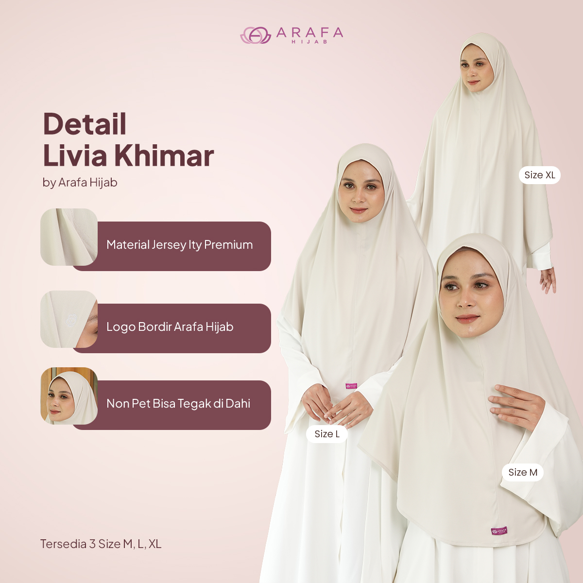 Hijab Livia merupakan hijab daily yang terbuat dari kain Jersey ITY yang lentur, fleksibel, dan lembut, memberikan kenyamanan maksimal tanpa gerah. Praktis dipakai tanpa perlu setrika atau jarum pentul, hijab ini bisa langsung digunakan dalam hitungan detik, menjadikannya pilihan sempurna untuk menemani aktivitas harian di rumah maupun berpergian.